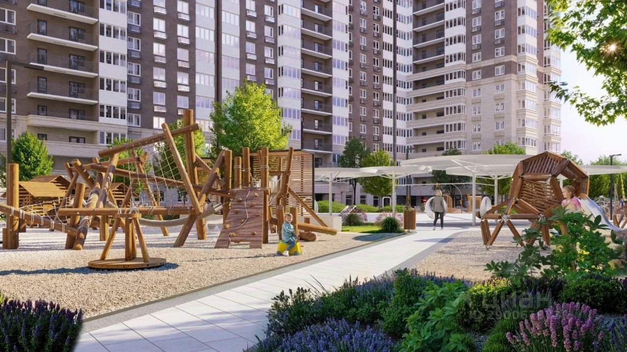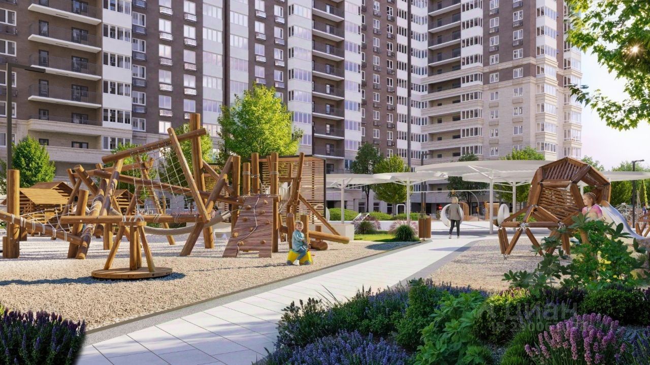 Современное благоустройство: Во дворах реализована концепция ''активити-парка'' — это большое зелёное пространство для отдыха и занятий спортом: • Детские площадки, разделенные по возрасту ребенка, • Зоны воркаута, йоги и командных игр, внесенные за периметр двора, • Озеленённые аллеи и уютные места для прогулок, • Общественные огороды для семейного досуга.