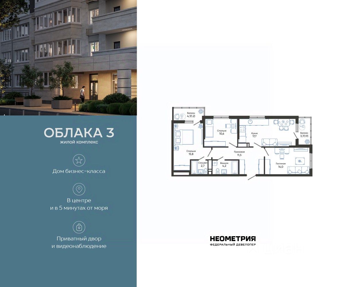 Продается квартира в жилом комплексе ''Облака'' от федерального девелопера ''Неометрия''. Современный жилой комплекс расположен на границе Южного и Центрального районов Новороссийска — в развитой, благоустроенной локации всего в 5 минутах езды от моря и центра города. Здесь мягкий климат, чистый воздух и гармоничное сочетание природы и городской инфраструктуры.