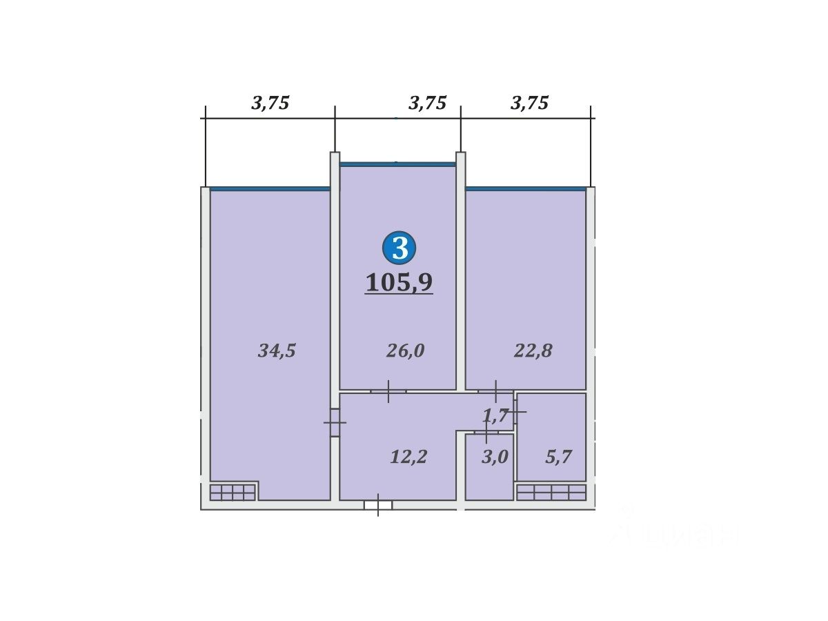 Общая площадь квартиры 105,9 кв.м.: - кухня гостиная - 22,8 кв.м., - комнаты - 34,5 и 26 кв.м., - просторный санузел 5,7 кв.м., - просторная прихожая с местом под гардеробную.
