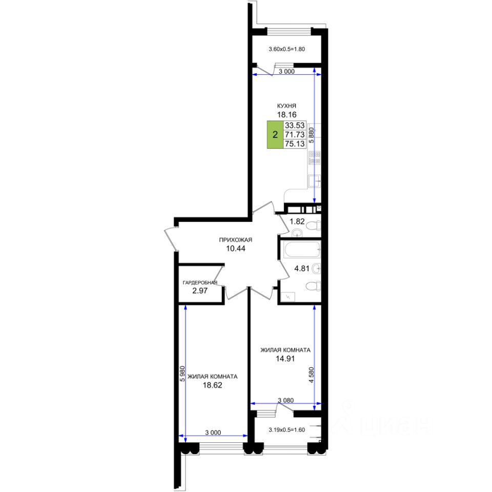 Продаётся 2-комнатная квартира в строящемся доме (Корпус В8), срок сдачи: IV-кв. 2026, общей площадью 75.13 кв.м., на 3 этаже. Обособленный тихий жилой микрорайон класса комфорт-плюс в Южном районе города Новороссийска, расположенный вдоль новой автодороги ''Южный обход''. Рядом находится крупный транспортный узел. Пересечение Мысхакского шоссе и автодороги Южный обход. Застройщиком будет запущен бесплатный электротранспорт до пляжа в с. Мысхако.