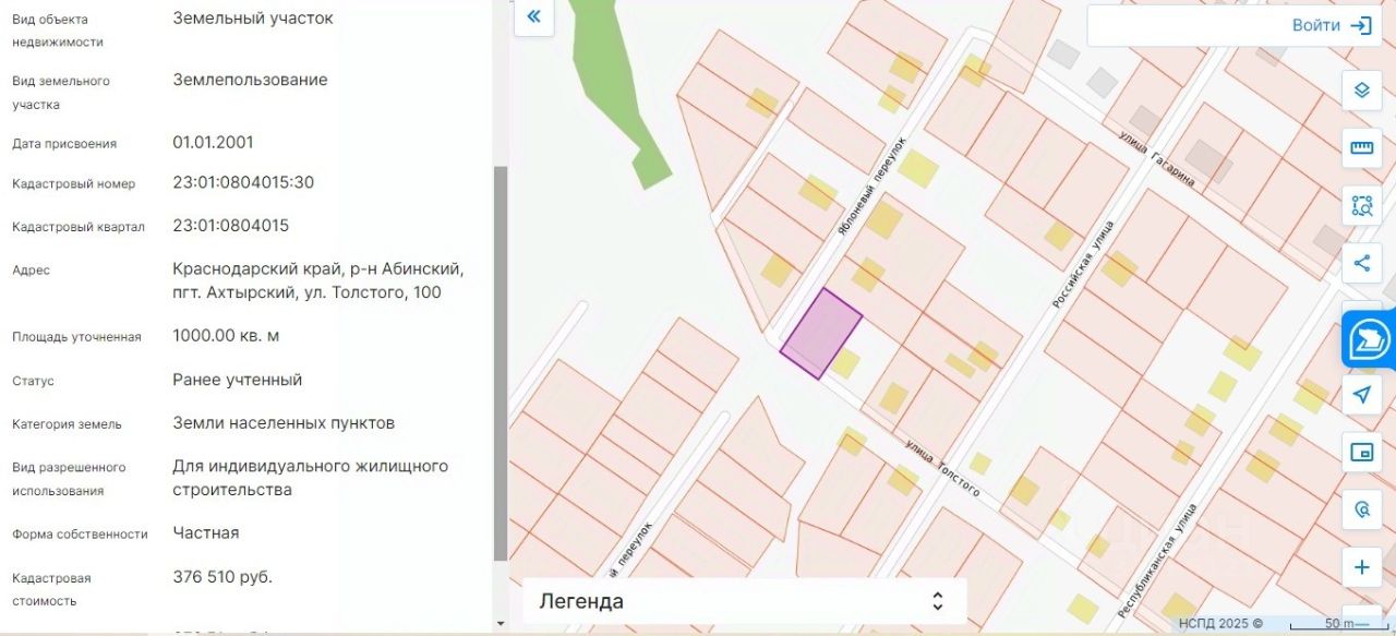 Продается земельный участок в поселке Ахтырском, Абинского района, Краснодарского края. Площадь 10 соток. В собственности, разрешенное использование ИЖС. Размер сторон = 25 на 40 метров. Угловое расположение с возможностью раздела. Абсолютно чистый, ровный, полностью готовый к строительству. Газовая труба проходит по меже, с 2-х сторон уже огорожен сплошным забором. Городок, ул. Толстого, вокруг жилая застройка. Полный пакет документов, проведено межевание, без обременений и особых зон.