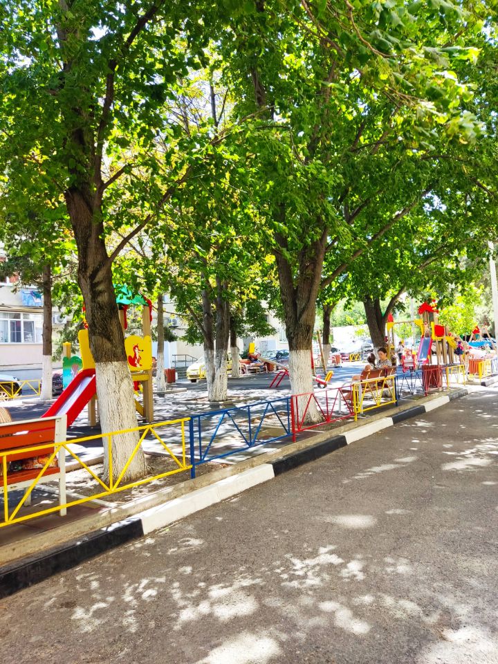 Во дворе очень зелено, есть современная детская площадка.