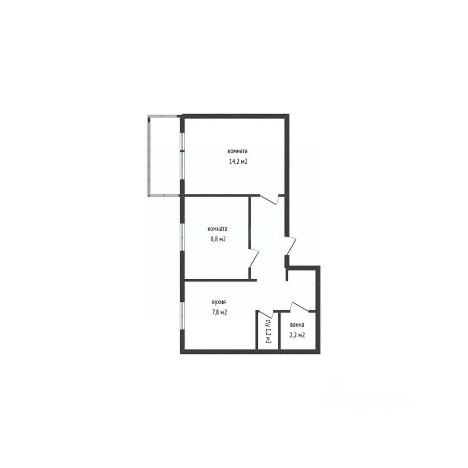 * Общая площадь: 44,4 м². * Жилая площадь: 23 м² (14,2 и 8,8 м²) \* Кухня: 7,6 м² — идеальное пространство для кулинарных экспериментов и уютных семейных ужинов. \* Санузел раздельный — комфорт и удобство для всей семьи.