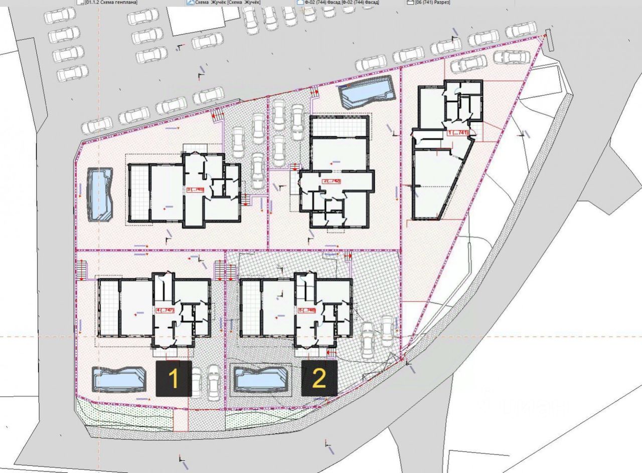 Расположены на участках от 4 до 5 соток, из которых 2 дома с цокольным этажом и 2 без него.