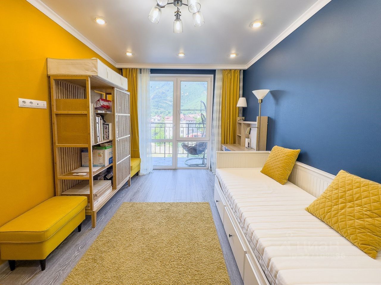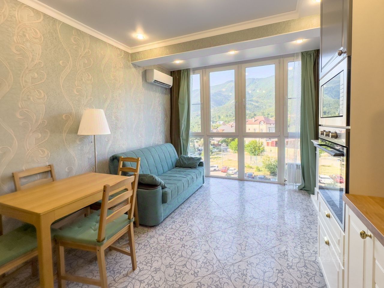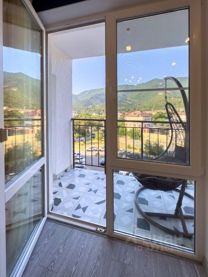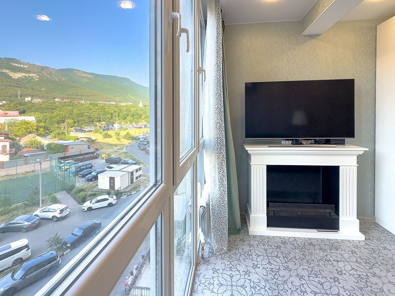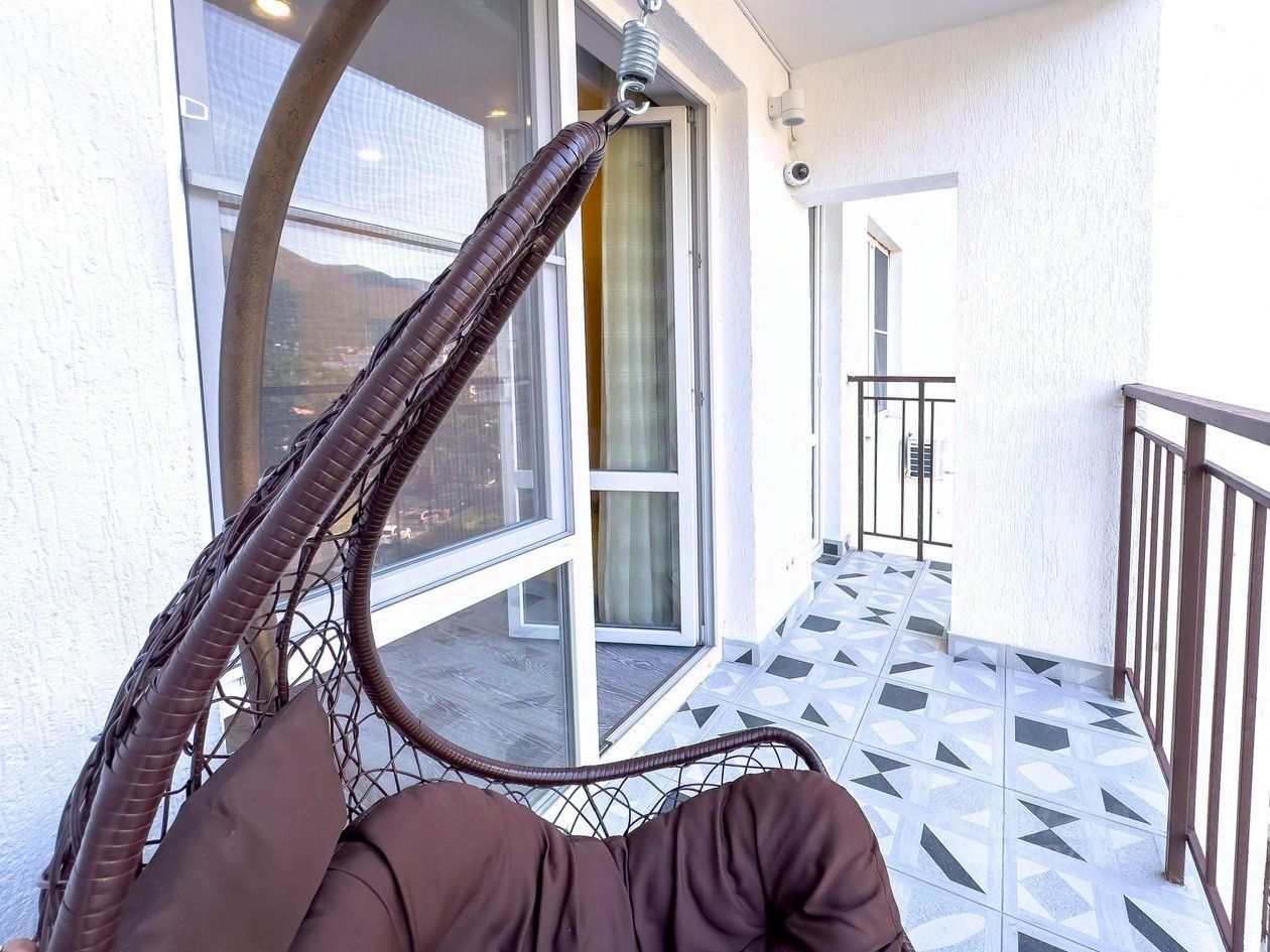 В кухне-гостиной и обеих спальнях с выходом на большую лоджию (5м2) из каждой комнаты, установлено УСИЛЕННОЕ панорамное остекление VEKA, которое открывает потрясающий вид на горы, позволяя наслаждаться красотой природы прямо из дома. Вечером в горах светятся обе канатки, что невероятно красиво.